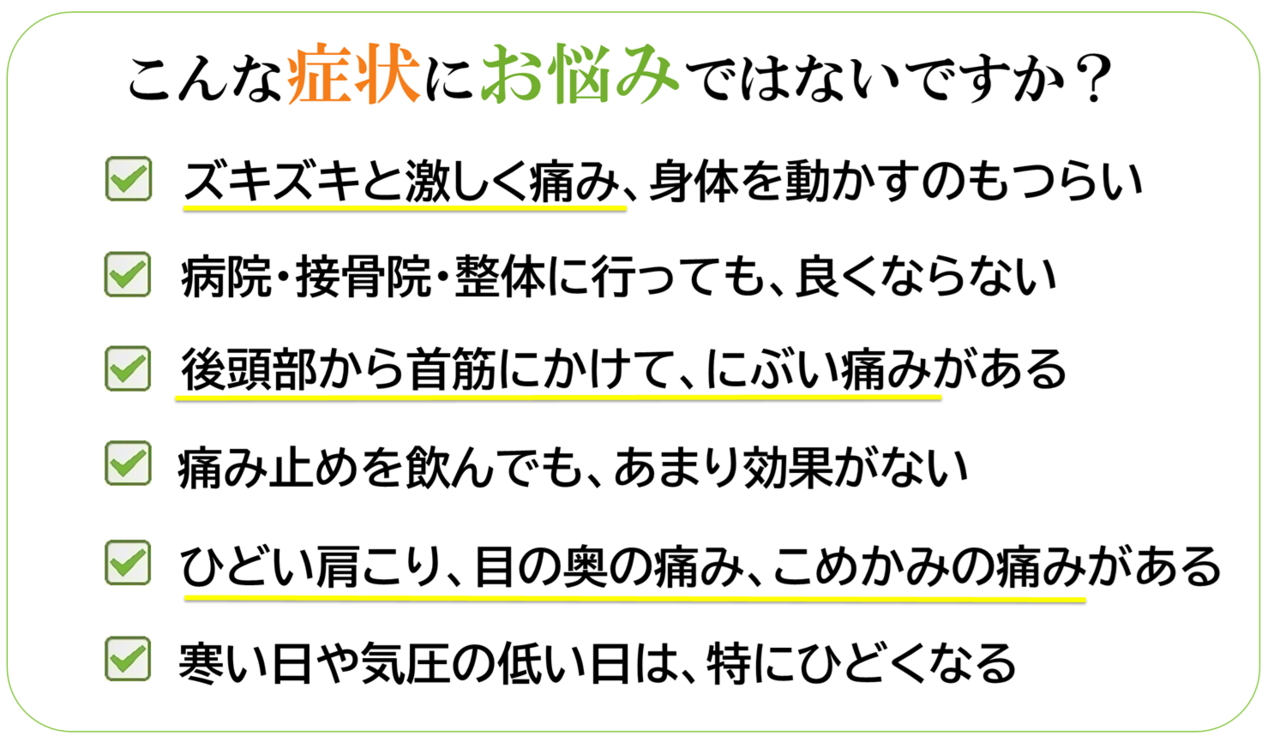 ・片側の首から後頭部・頭頂部にかけて、チクチク、キリキリ、ズキズキとした激痛がある。